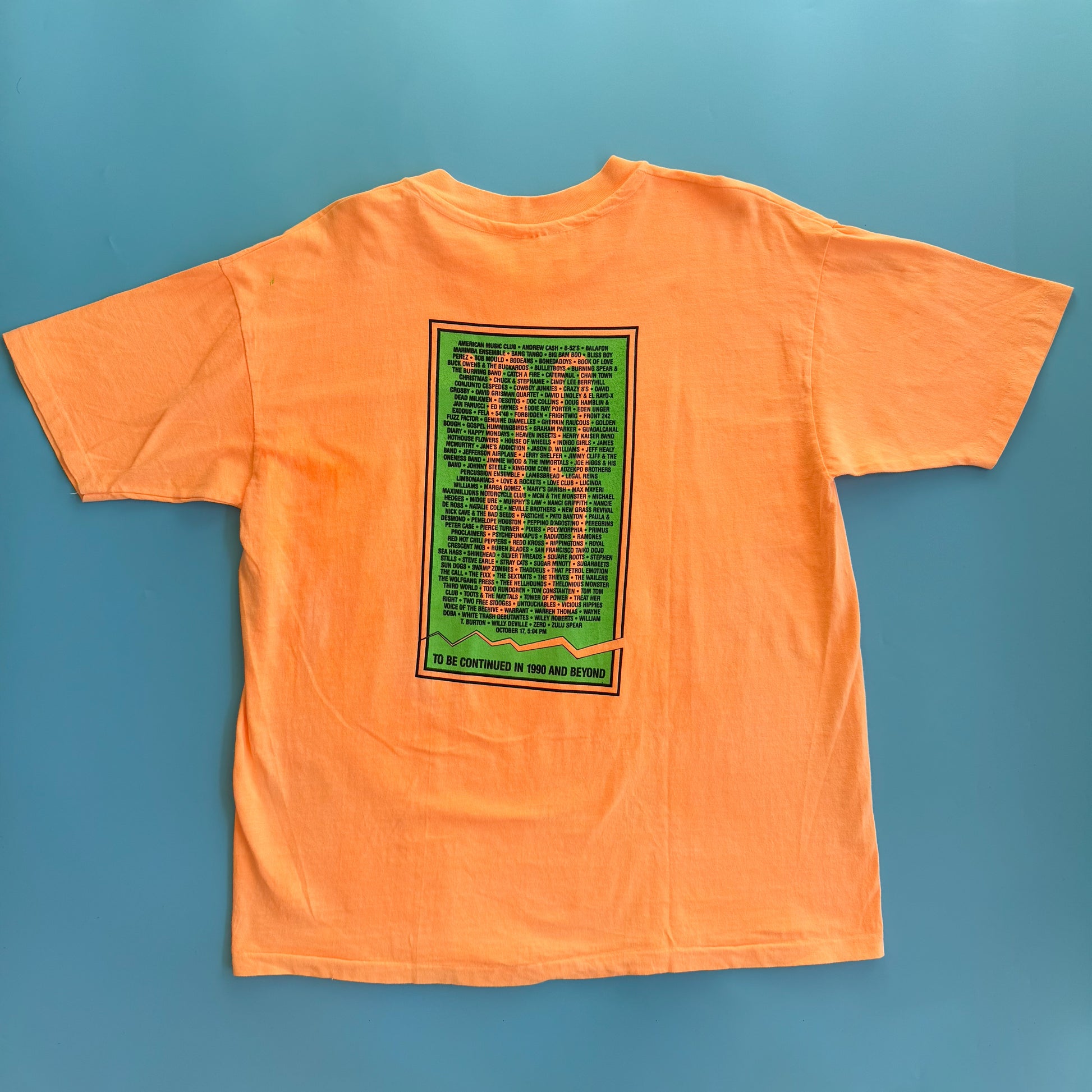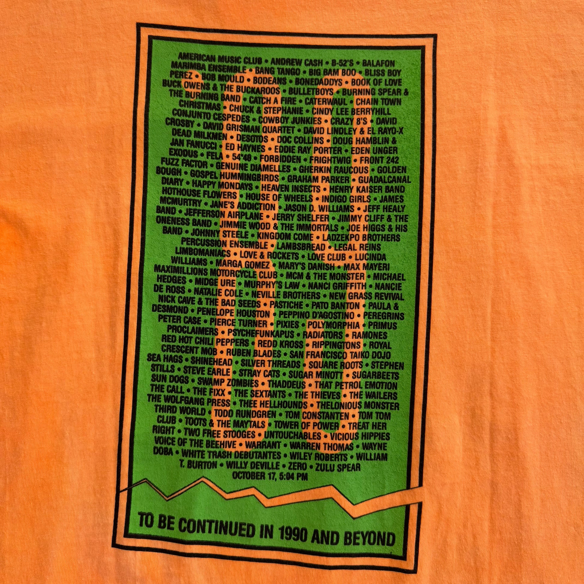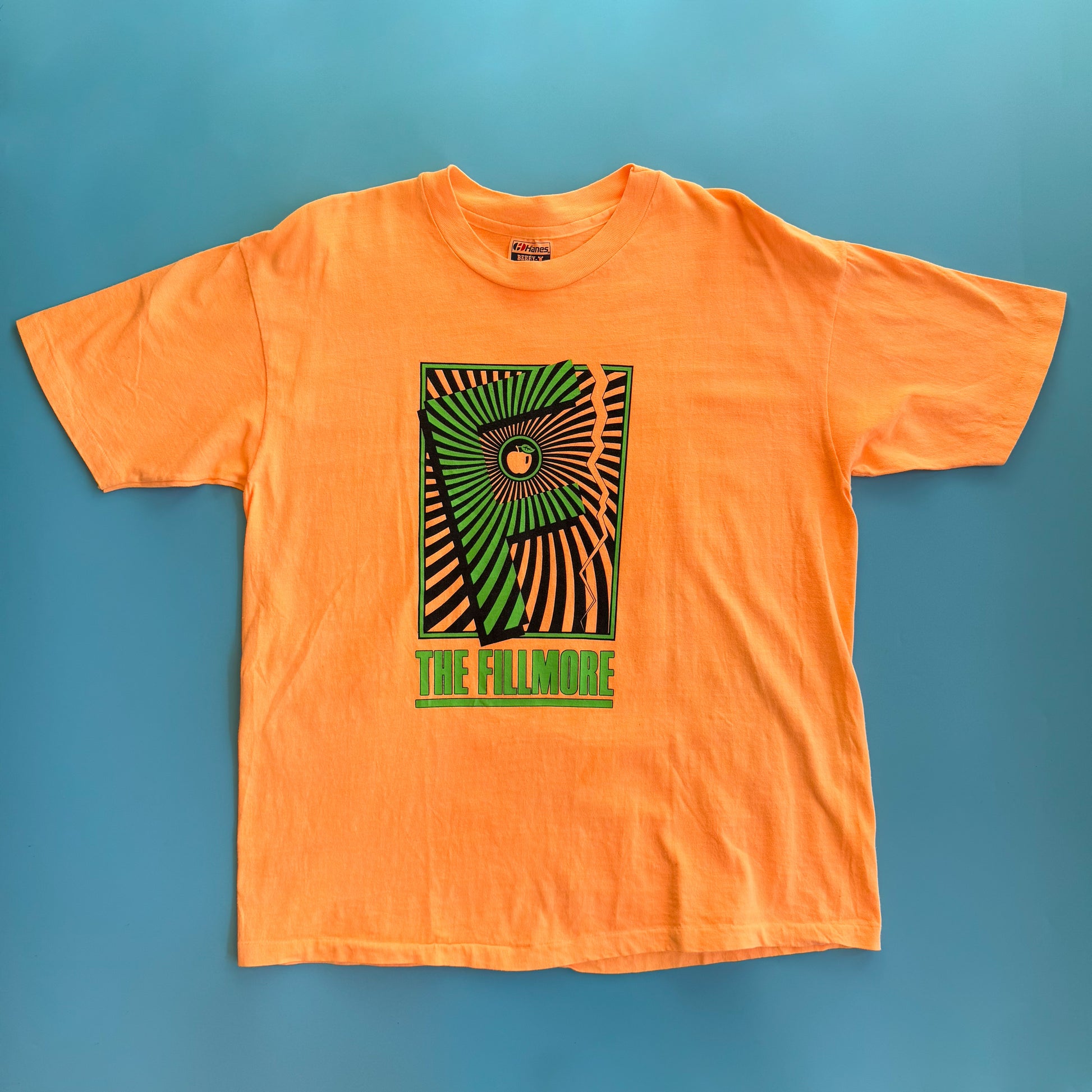 This rare T Shirt commemorates The Fillmore West of San Francisco. The design showcases the venue's iconic apple logo and shows a crack representing the club’s closure following the Bay Area’s Loma Prieta earthquake on October 17, 1989. The back graphic lists all the bands that played this legendary venue during the year 1989.