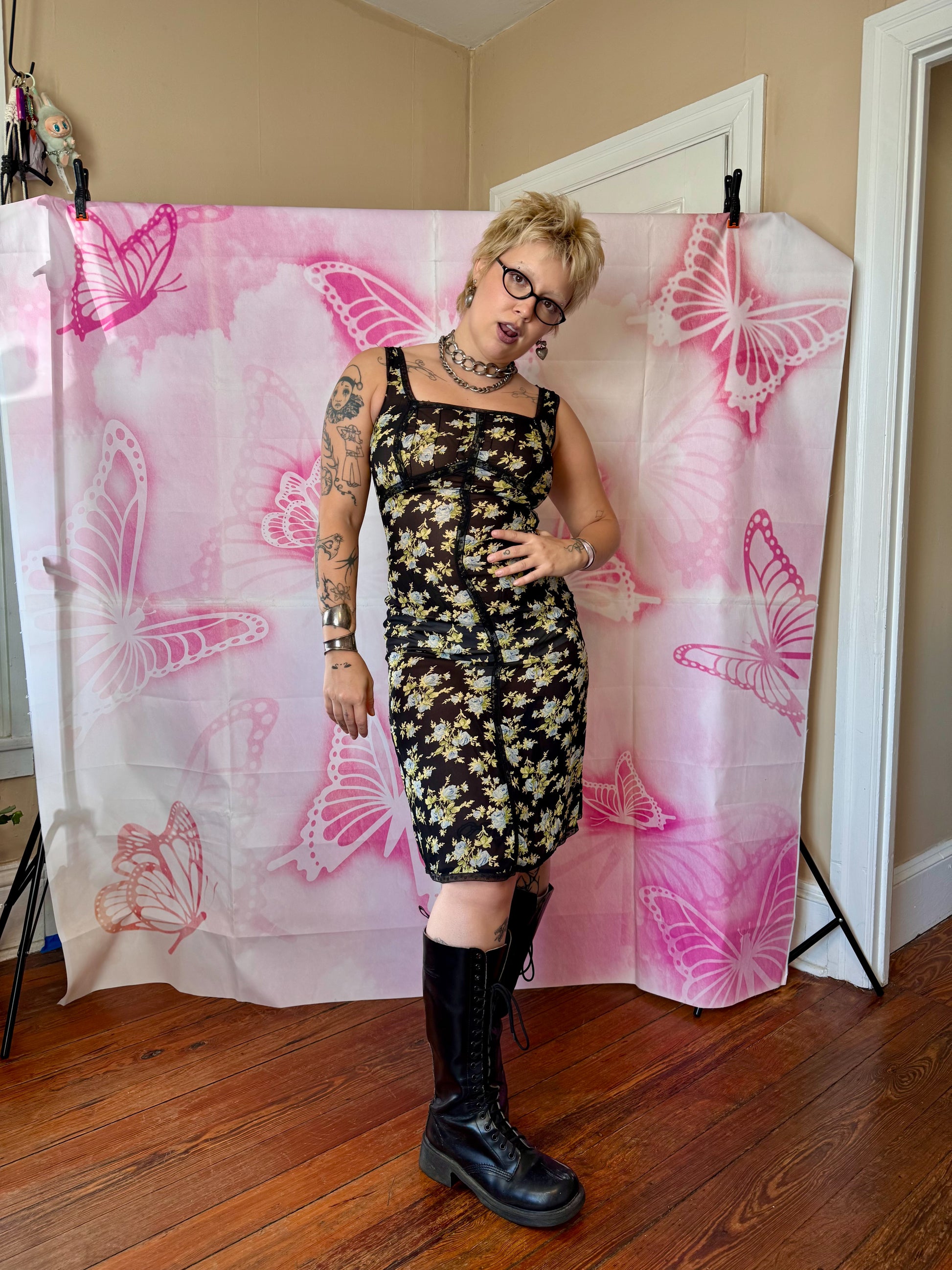 Spring 2000 Betsey Johnson Black Label Floral Sheer Slip Dress.