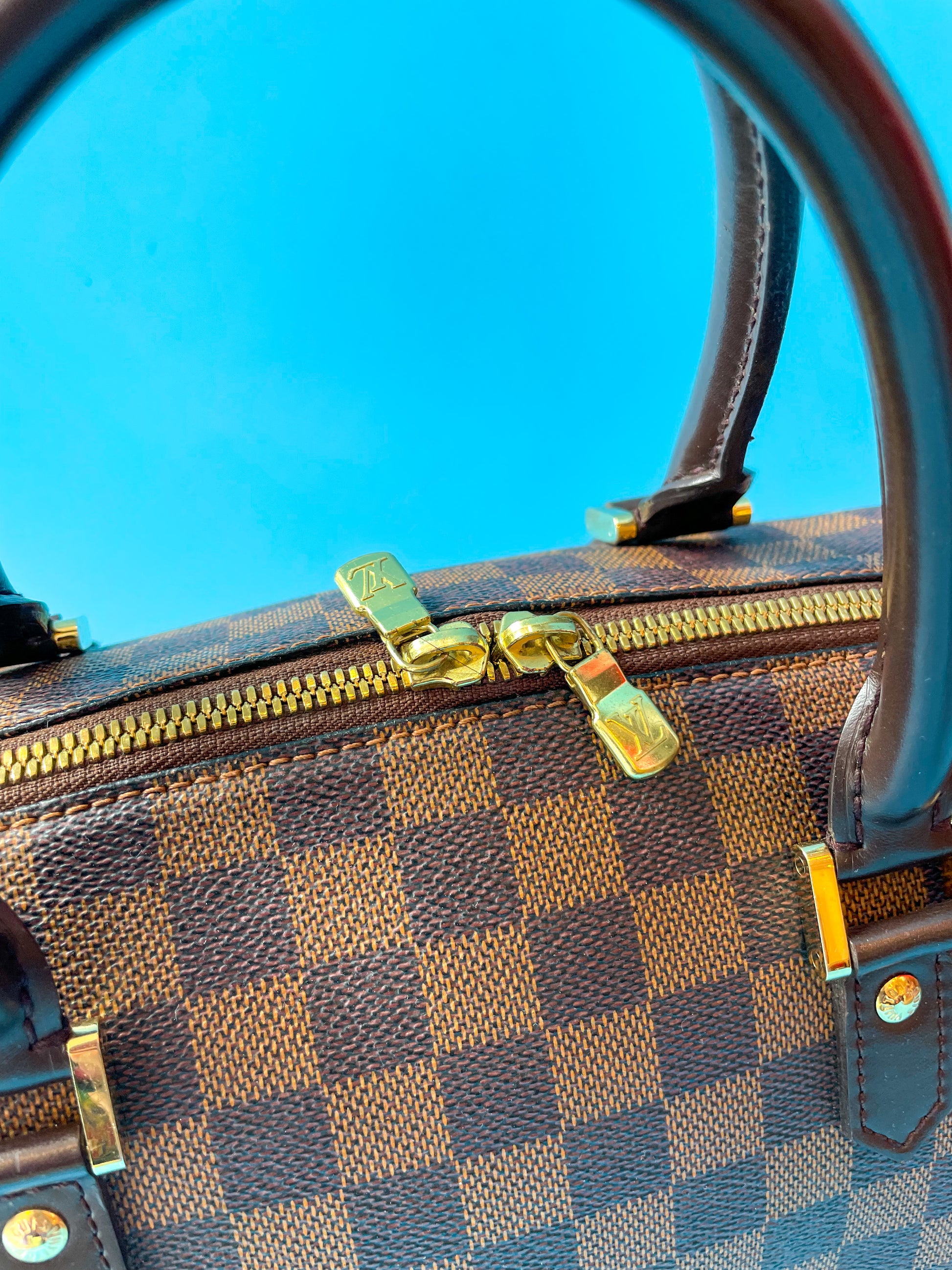 Sleek and structured, this medium-sized rendition of the Rivera silhouette comes crafted from Damier Ebene checkered coated canvas with brown leather trim and gold-tone brass hardware for shine. Unzip yours along its curved frame to reveal a mood-boosting, poppy-orange canvas interior that's sure to fit all of your belongings.