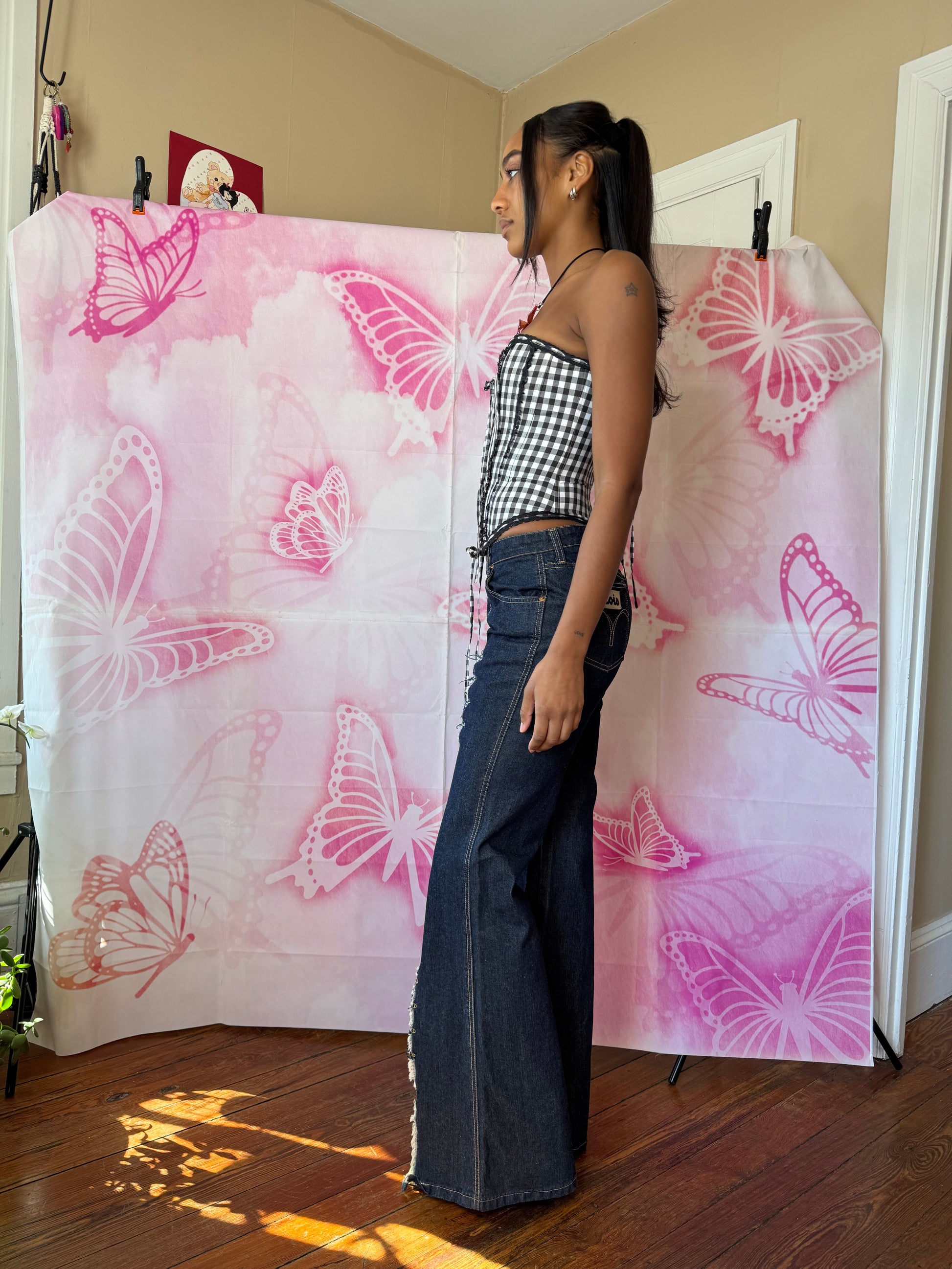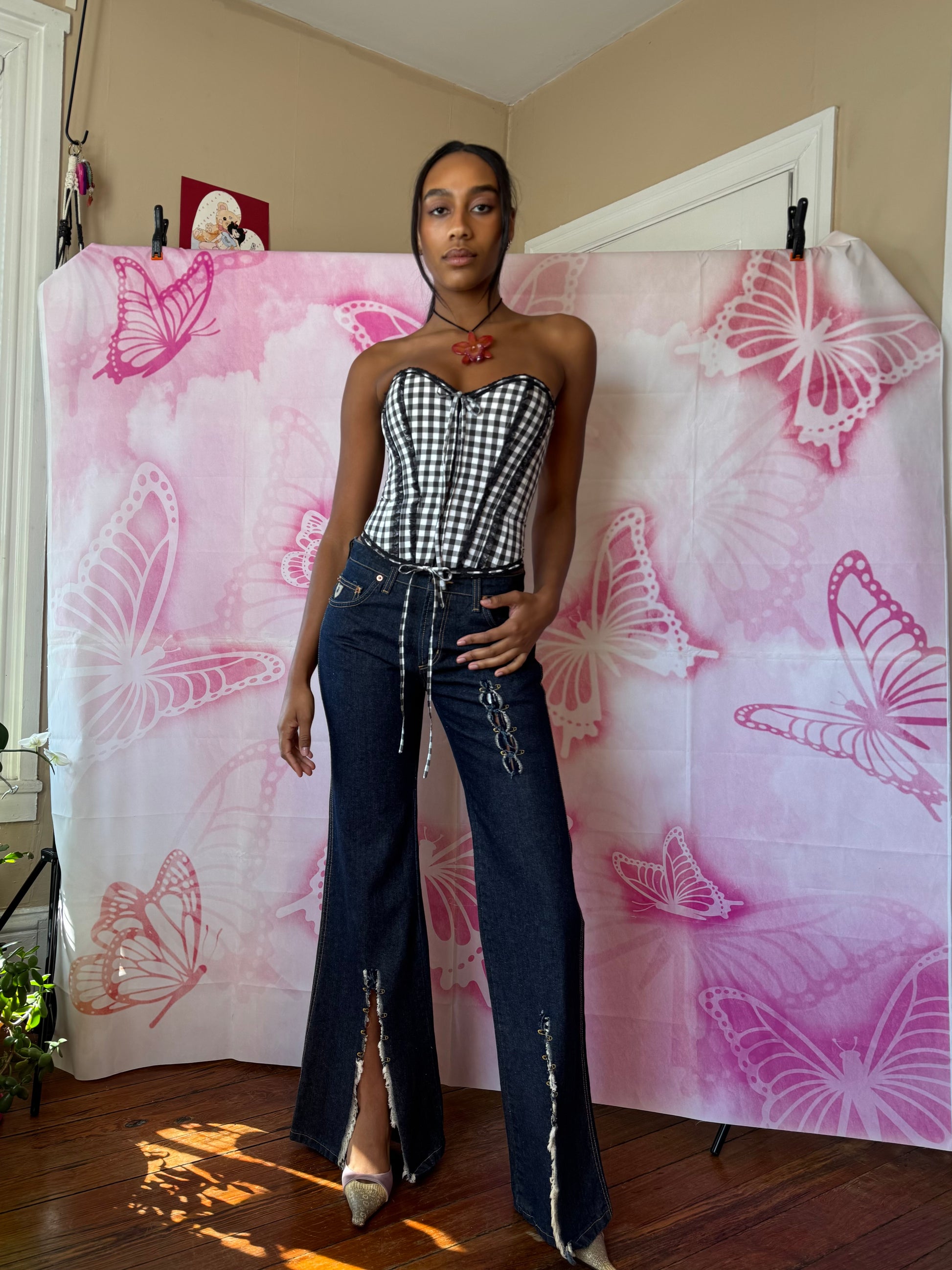 Measurements: 30” waist, 38” hips, 10” rise, 34” inseam, 12” leg opening