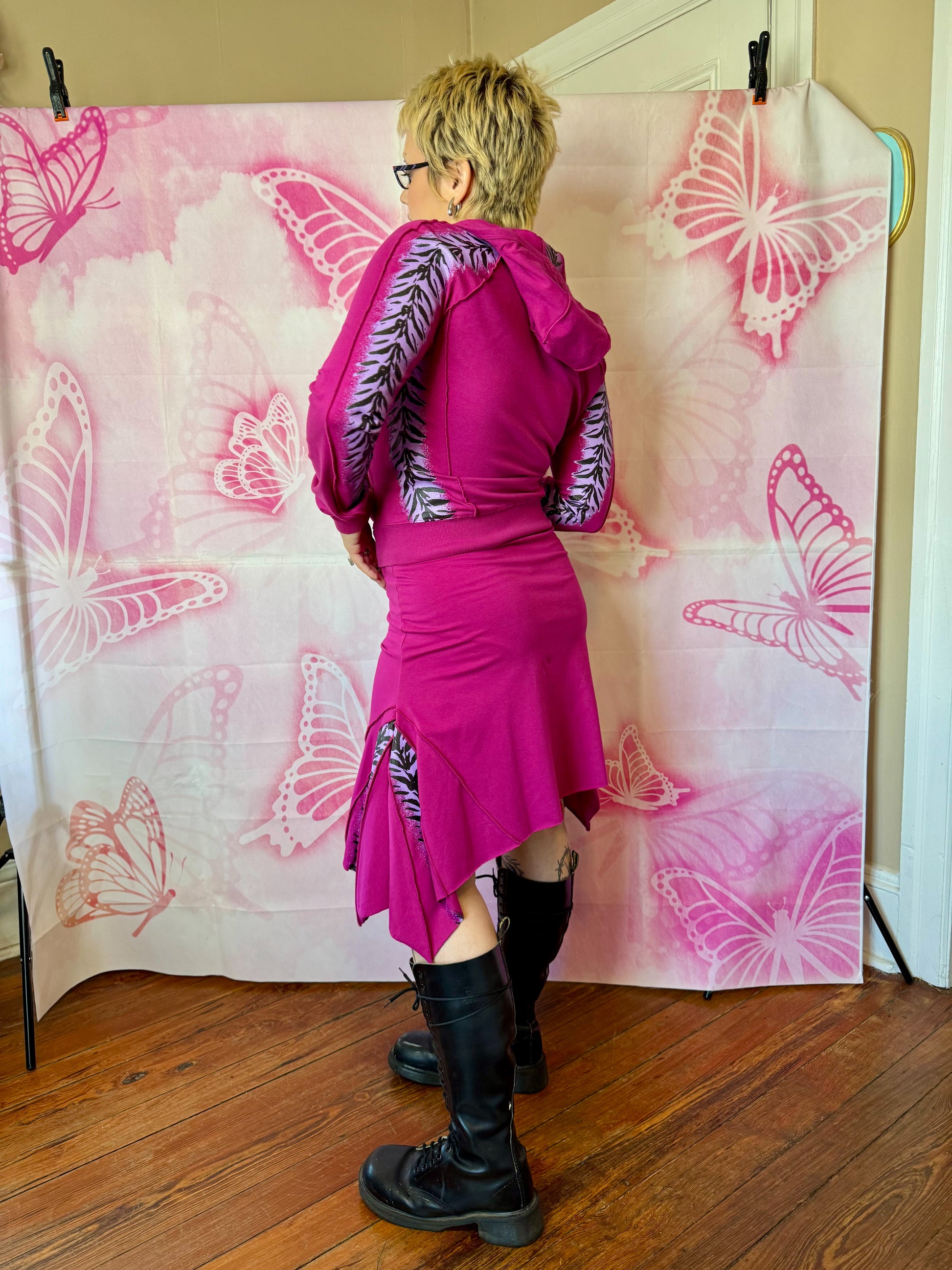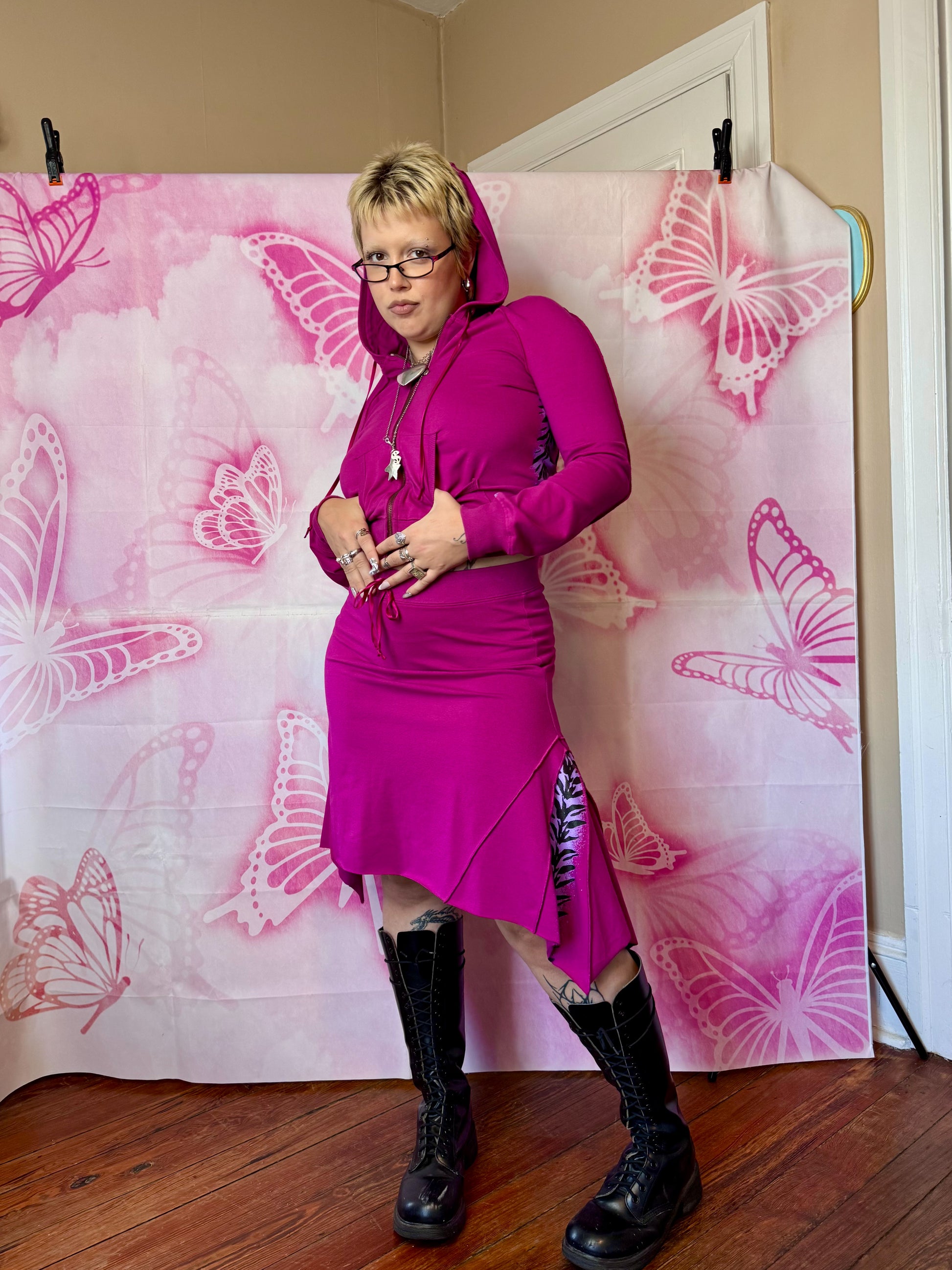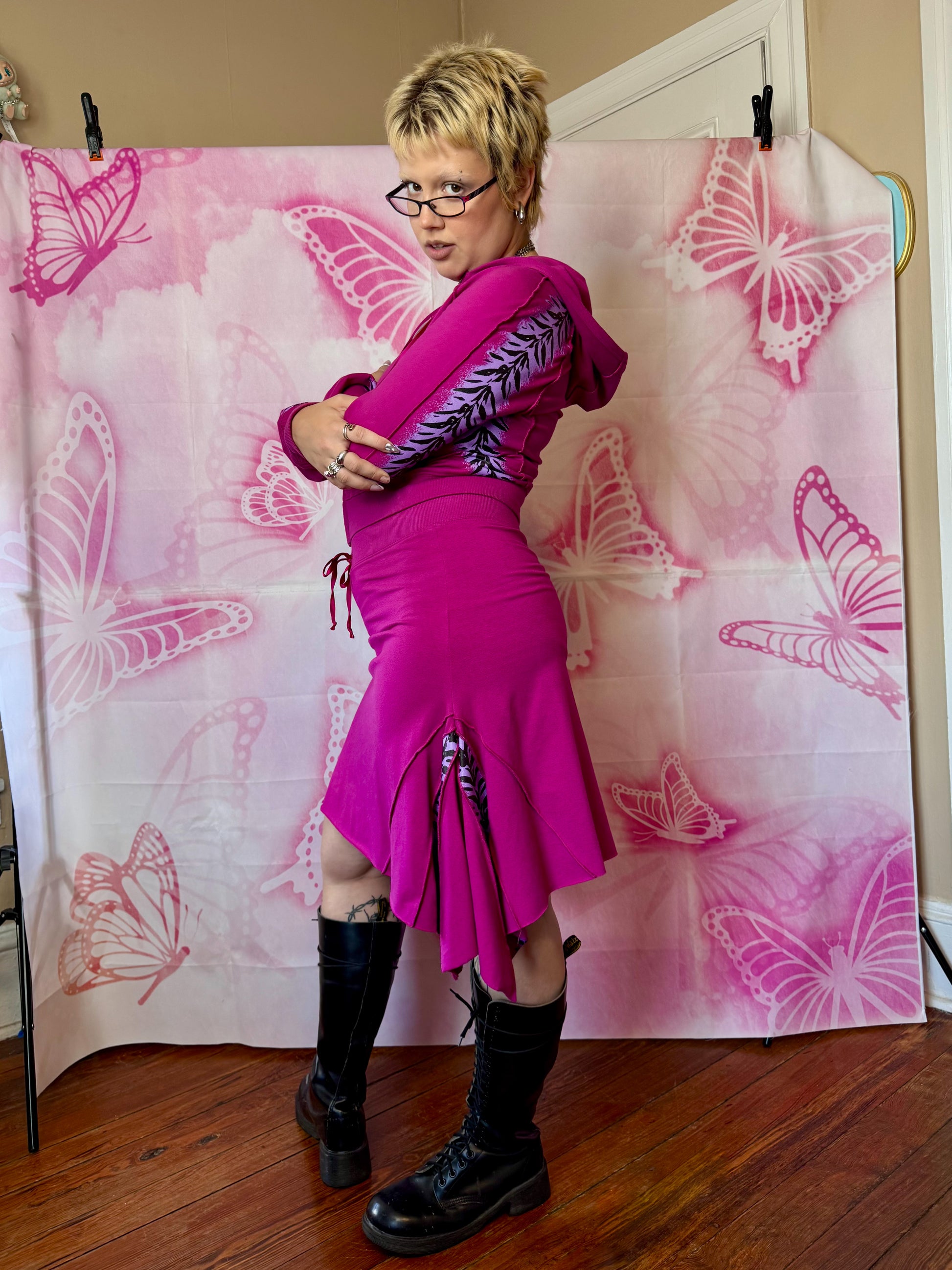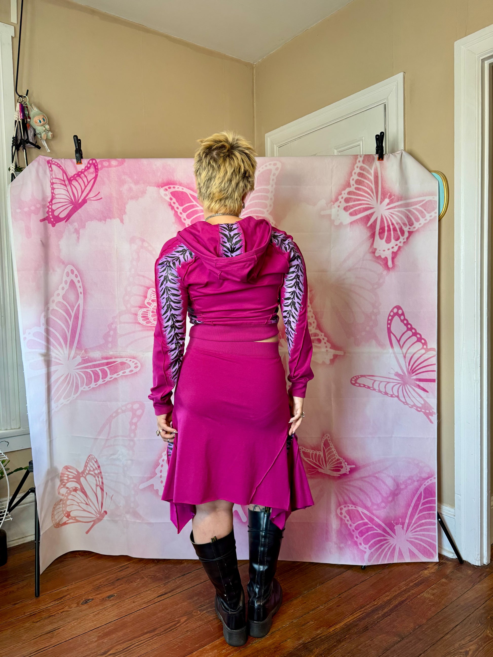Measurements: Jacket: 38" bust, 34" waist, 20" shoulder to hem: 18" long zipper to hem; Skirt: 30" waist, 38" hips, 19" long, 25" long on asymmetrical hem