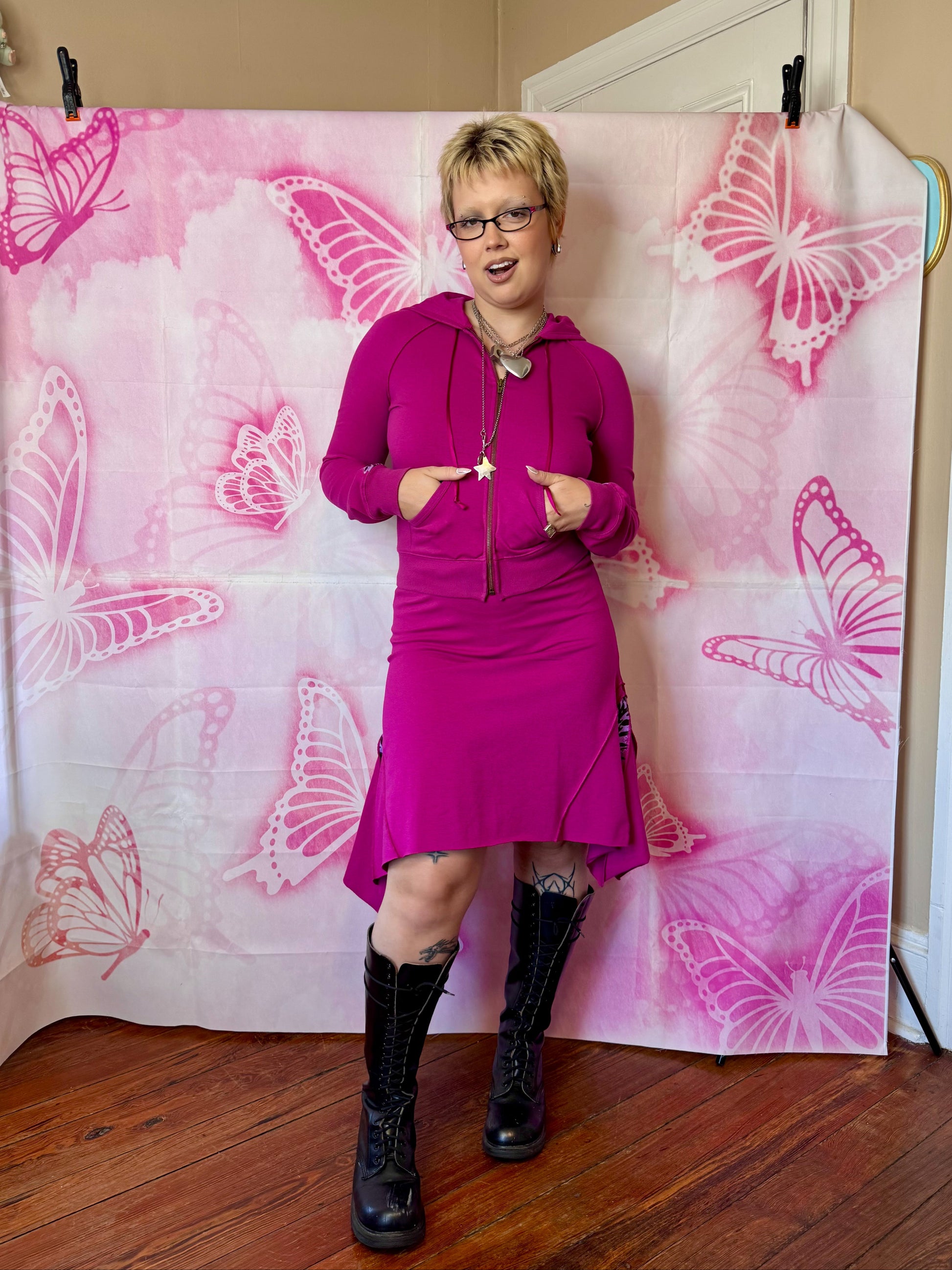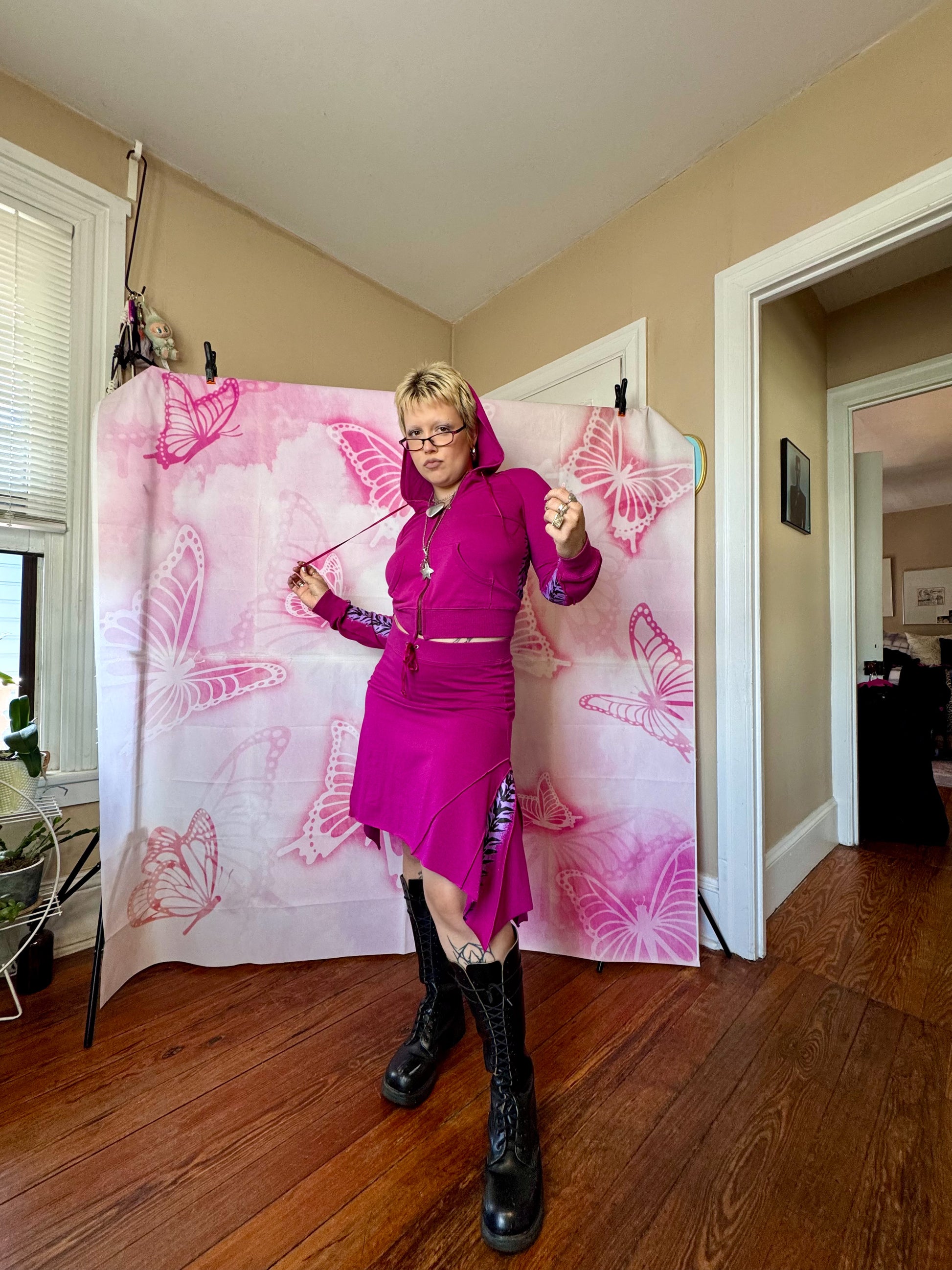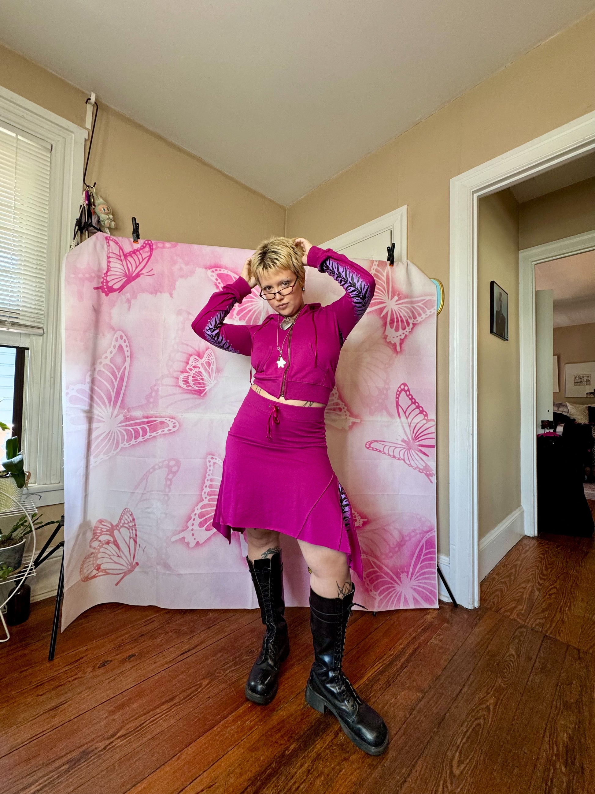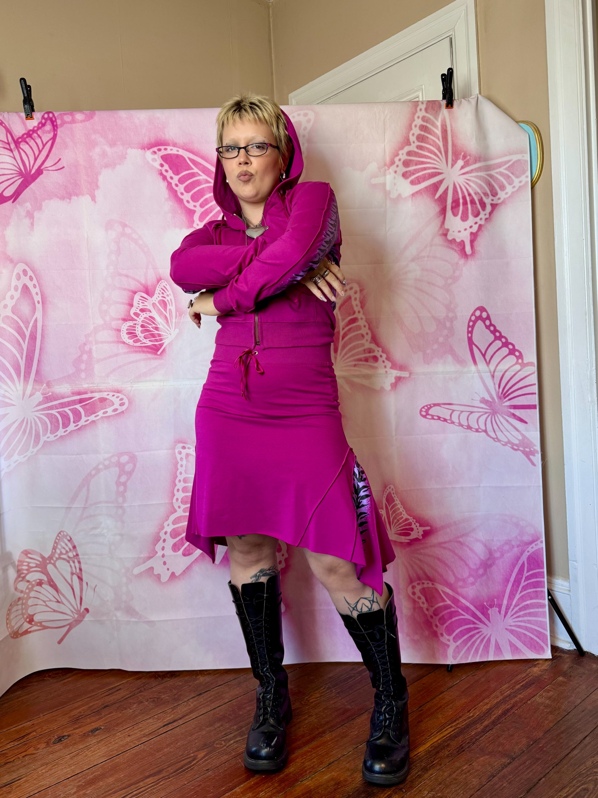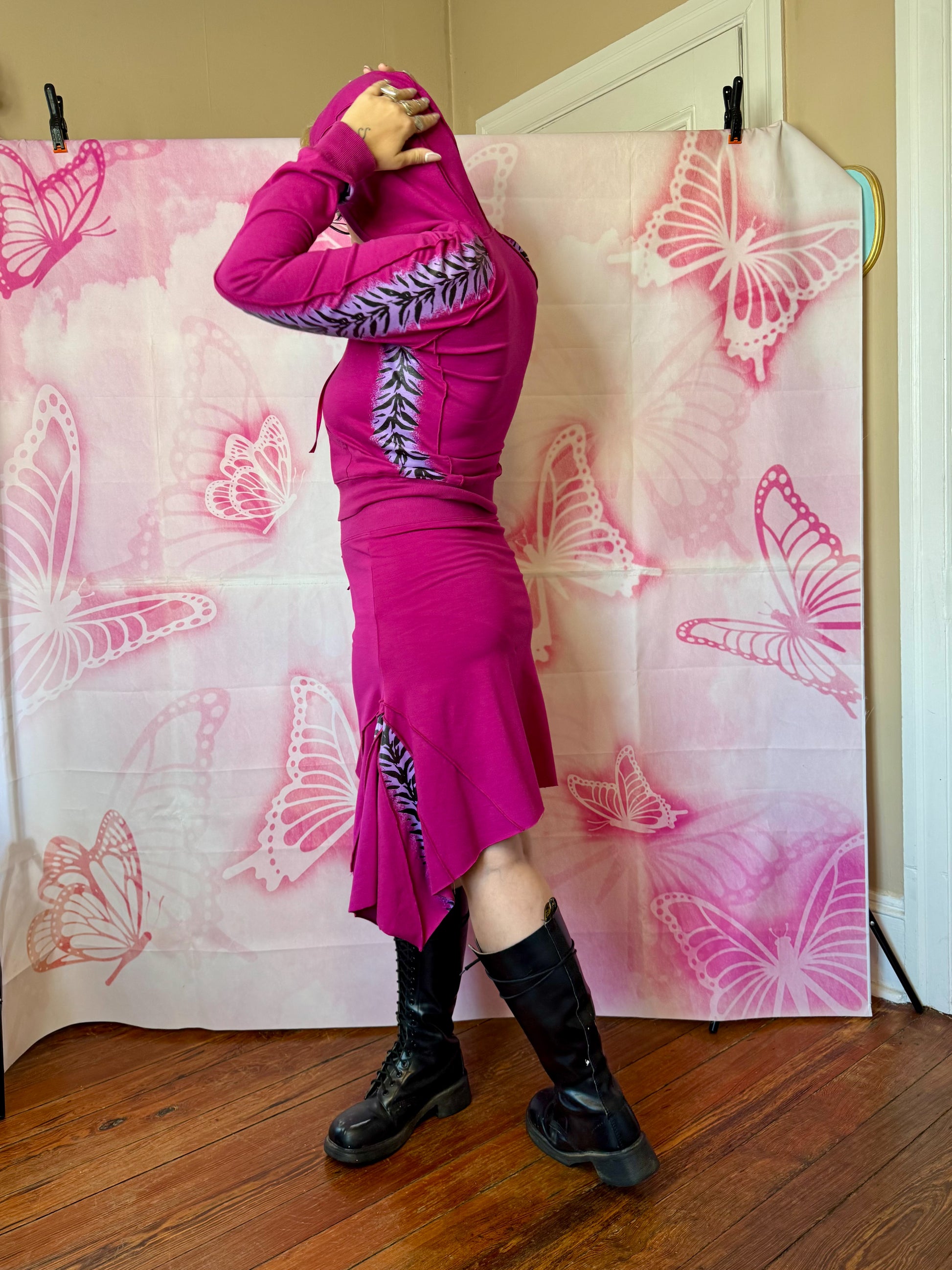 Measurements: Jacket: 38" bust, 34" waist, 20" shoulder to hem: 18" long zipper to hem; Skirt: 30" waist, 38" hips, 19" long, 25" long on asymmetrical hem