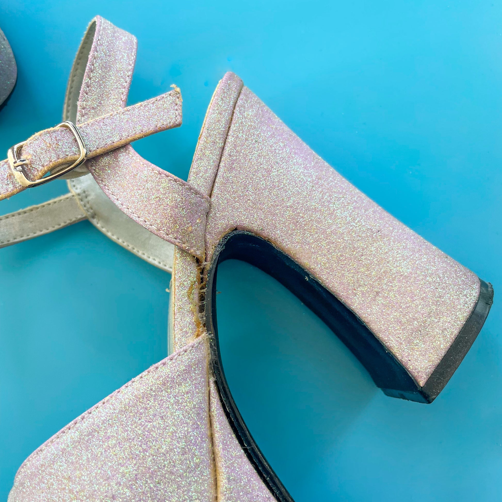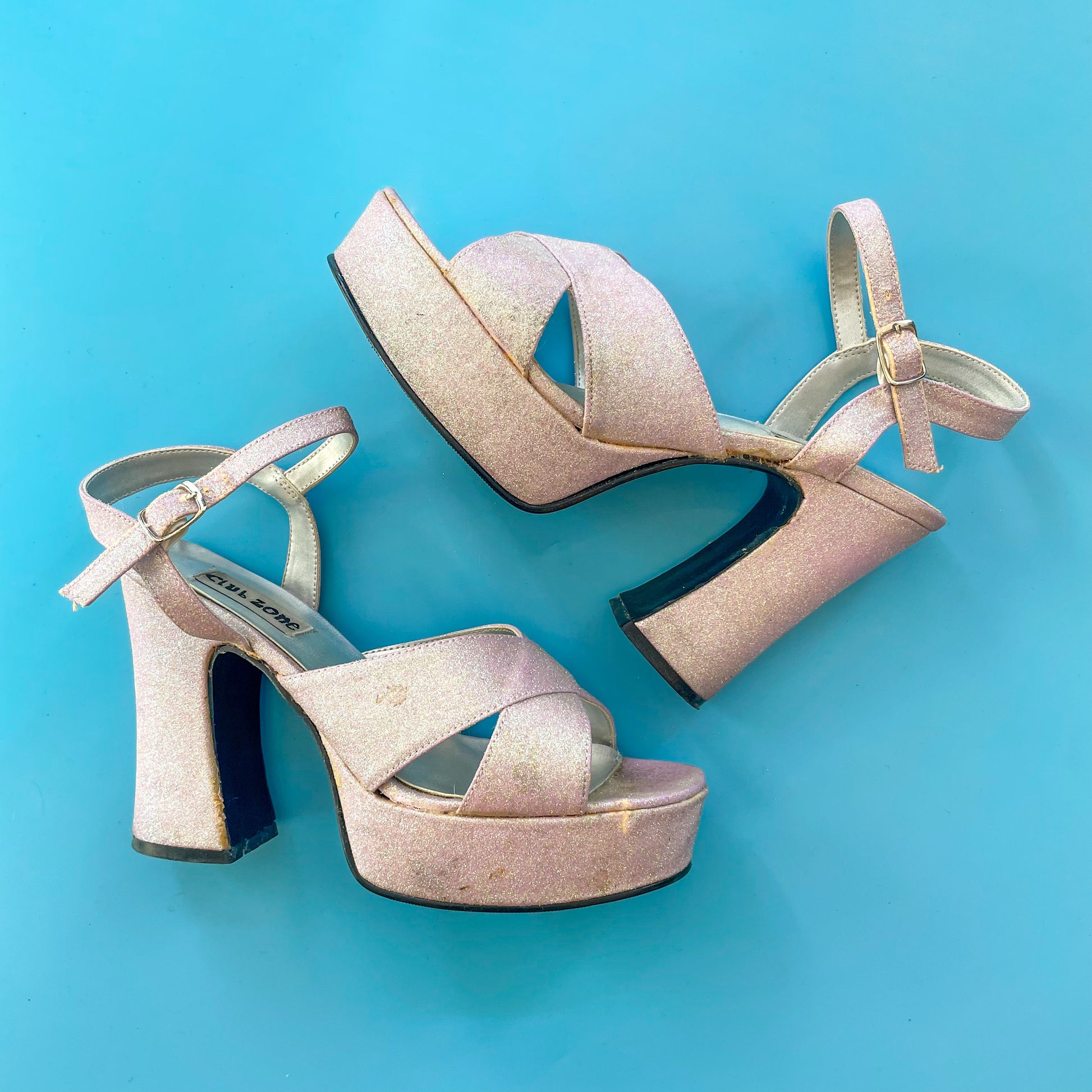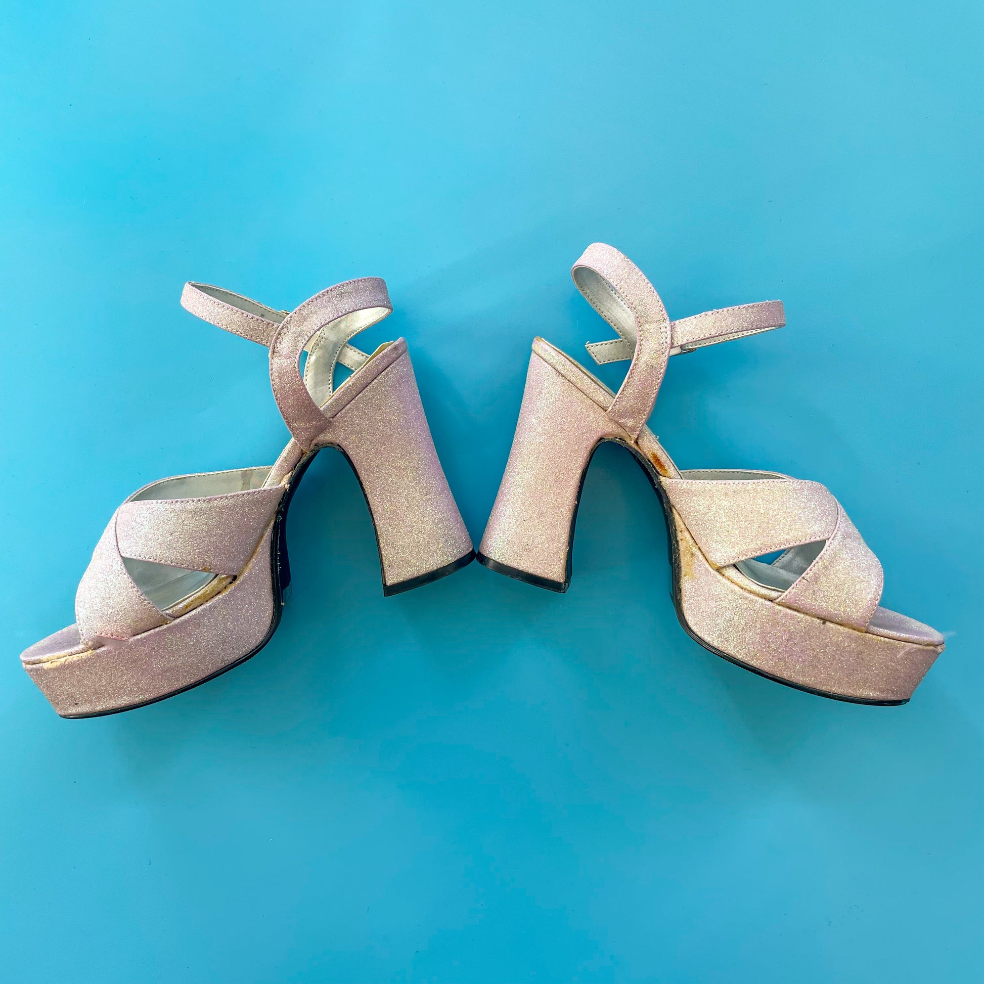 Measurements: 4.75” heel, 1.25” platform, 9” long, 2.75” at widest part