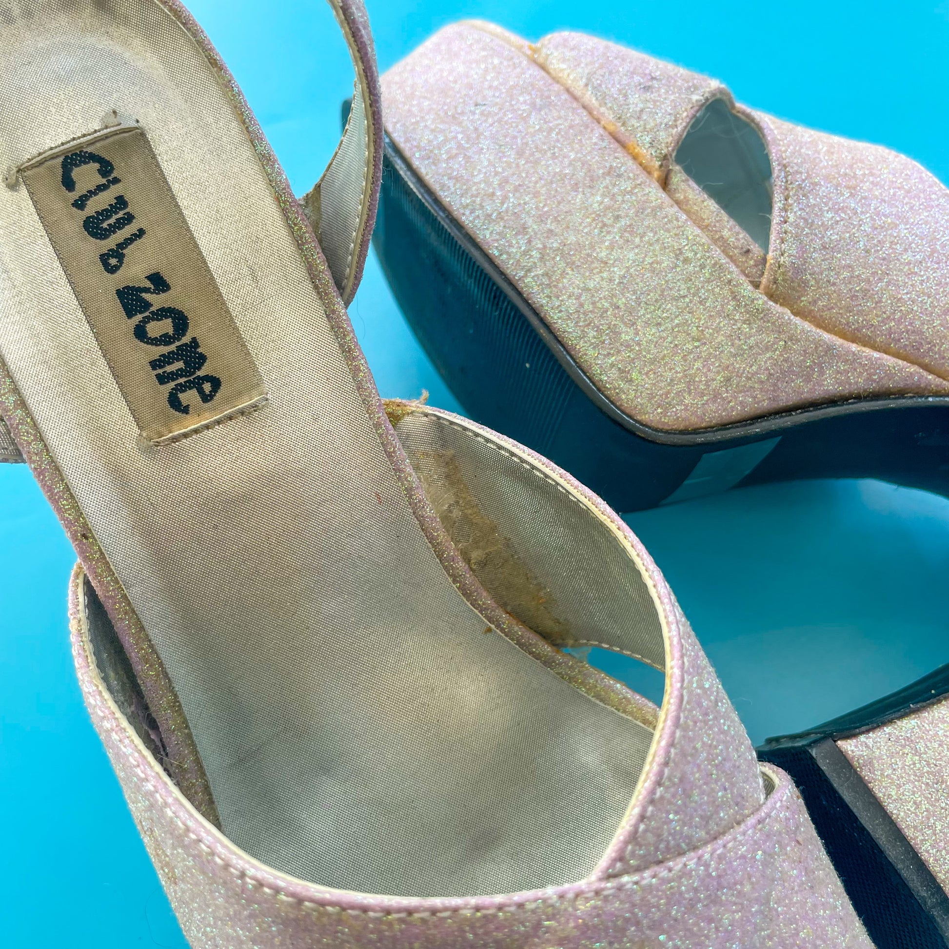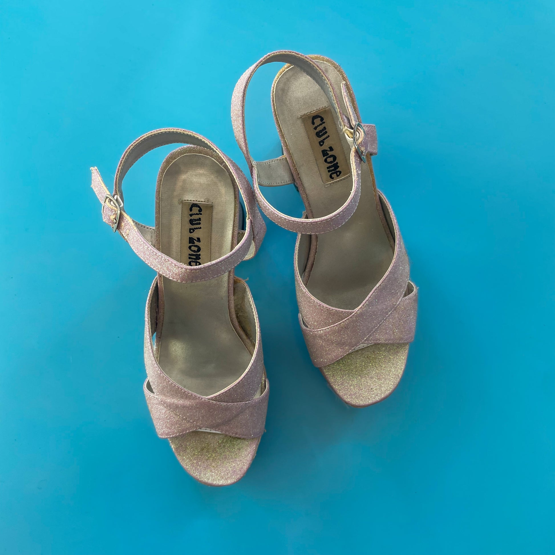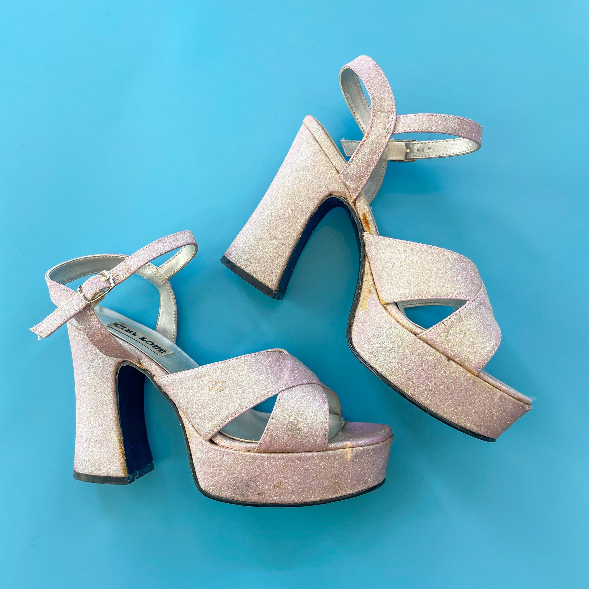 Measurements: 4.75” heel, 1.25” platform, 9” long, 2.75” at widest part