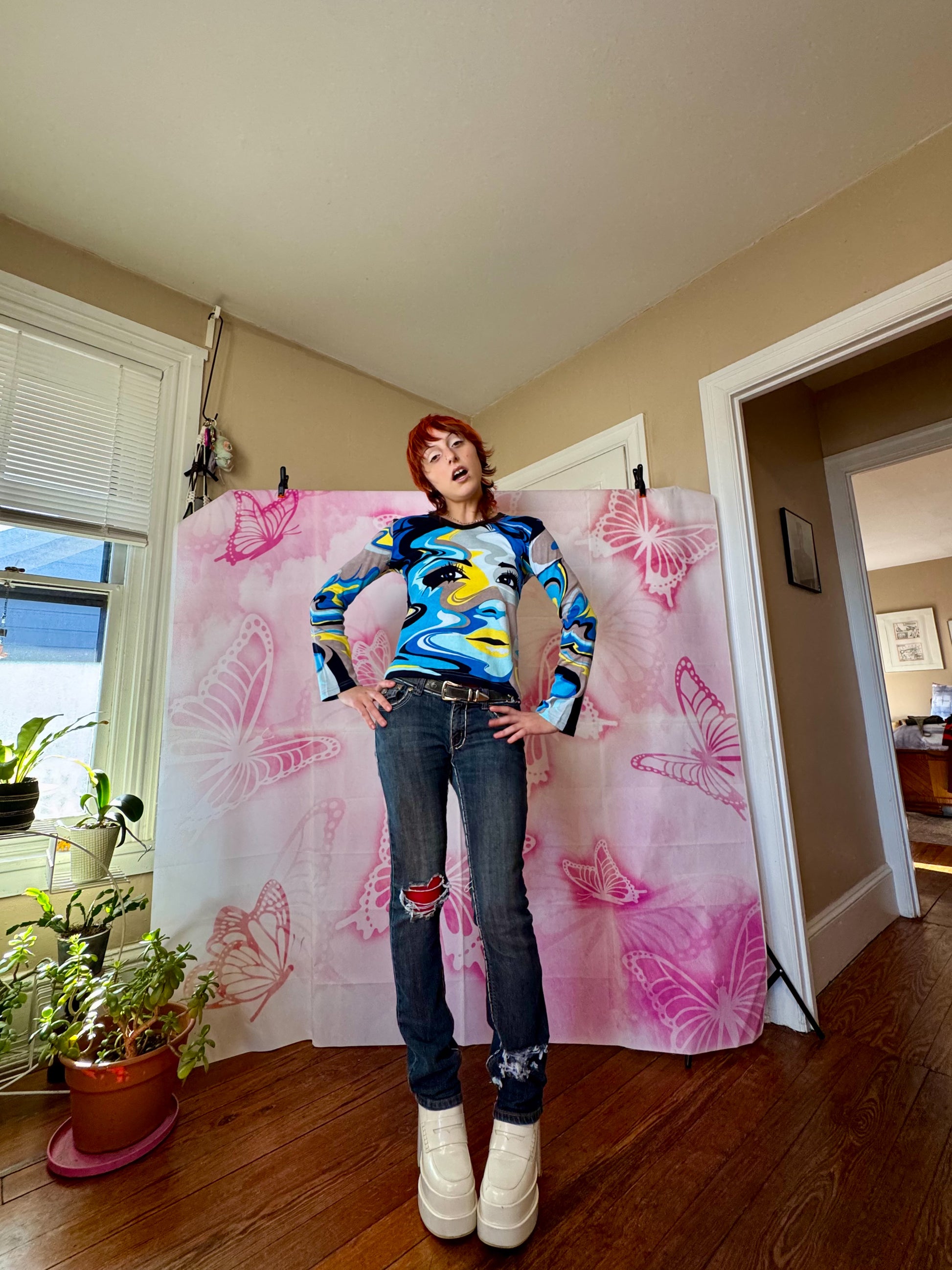 Measurements: 16.5" shoulder to shoulder, 40" bust, 21" shoulder to hem, 17" v neckline to hem