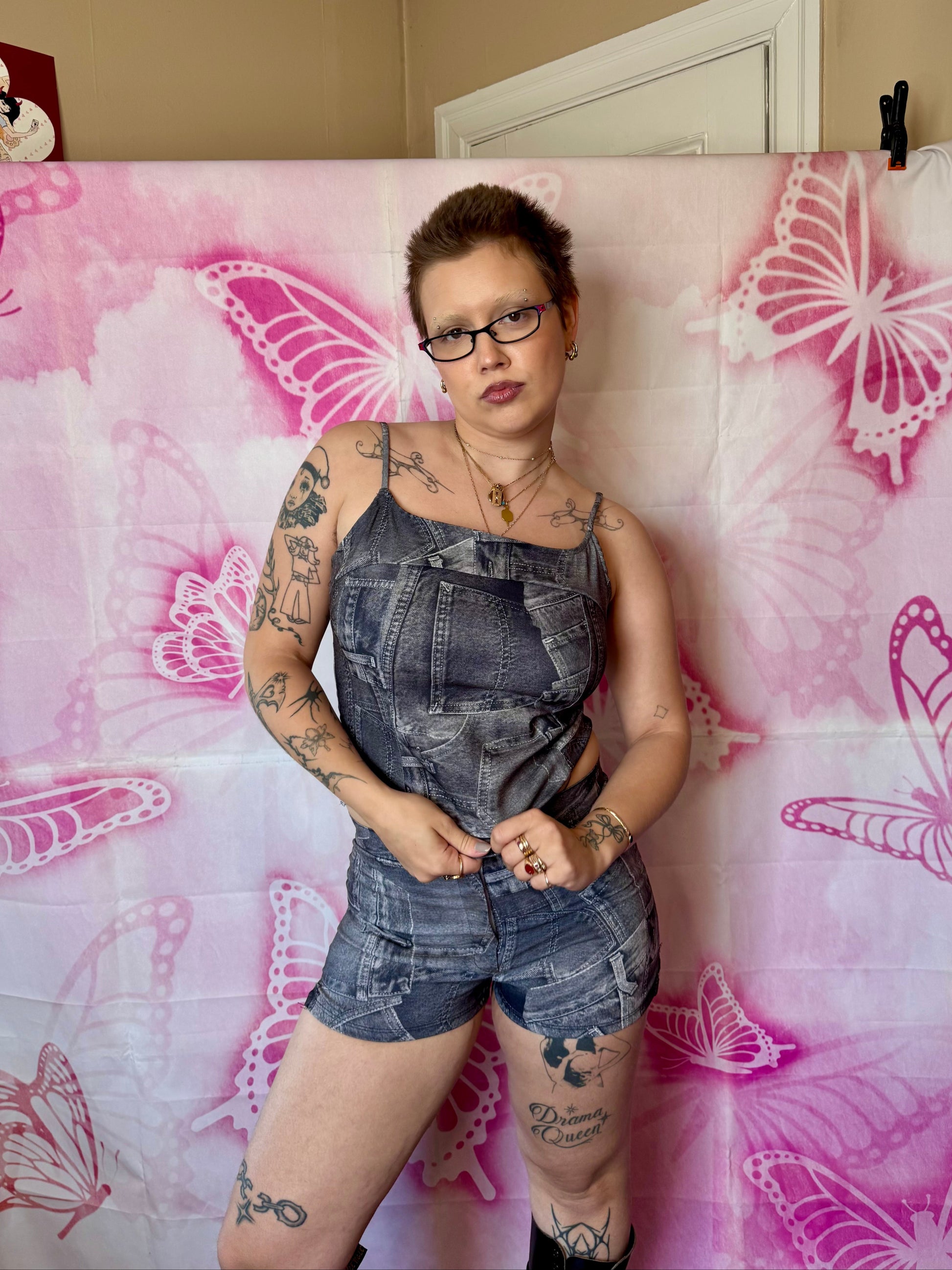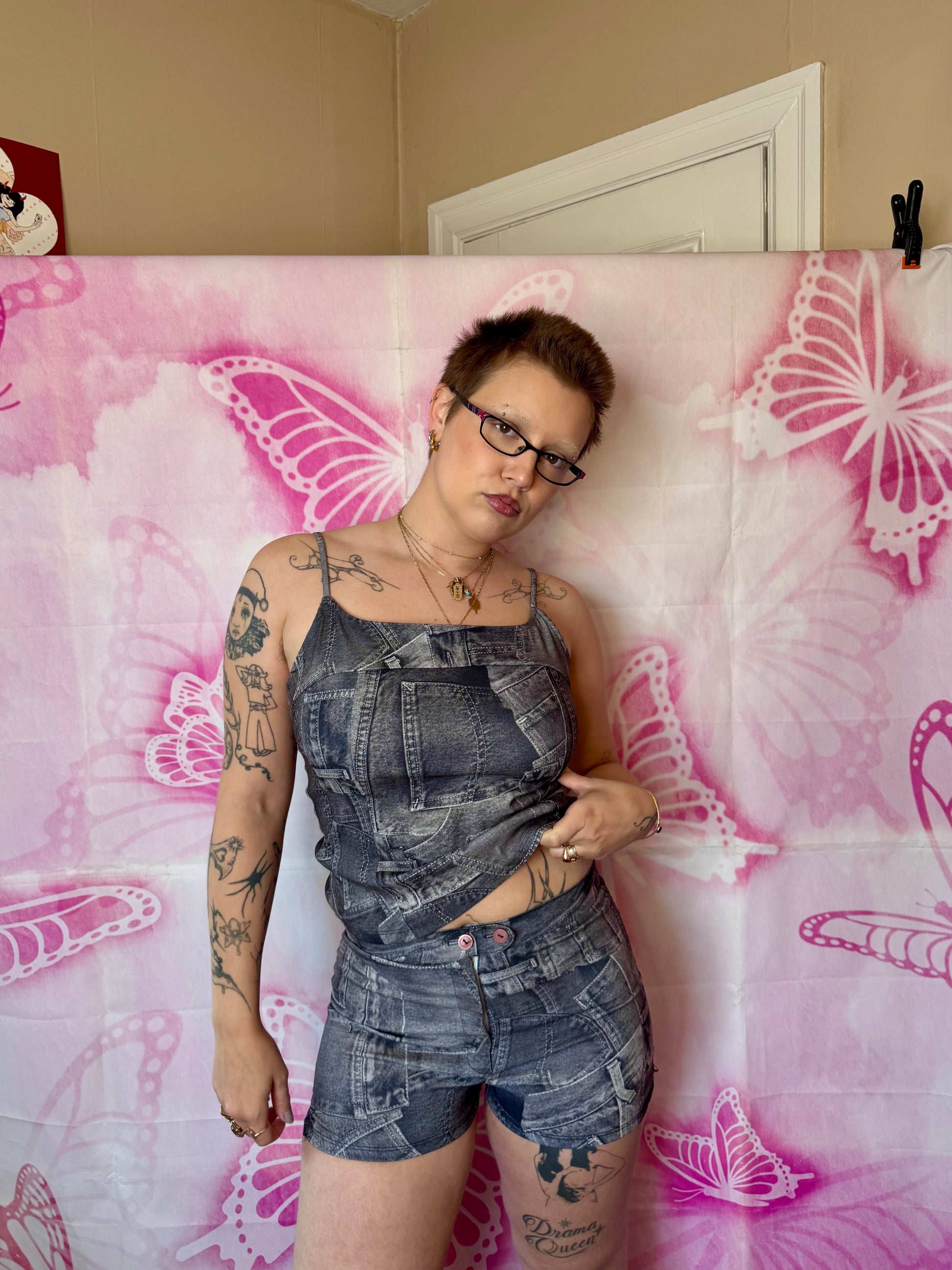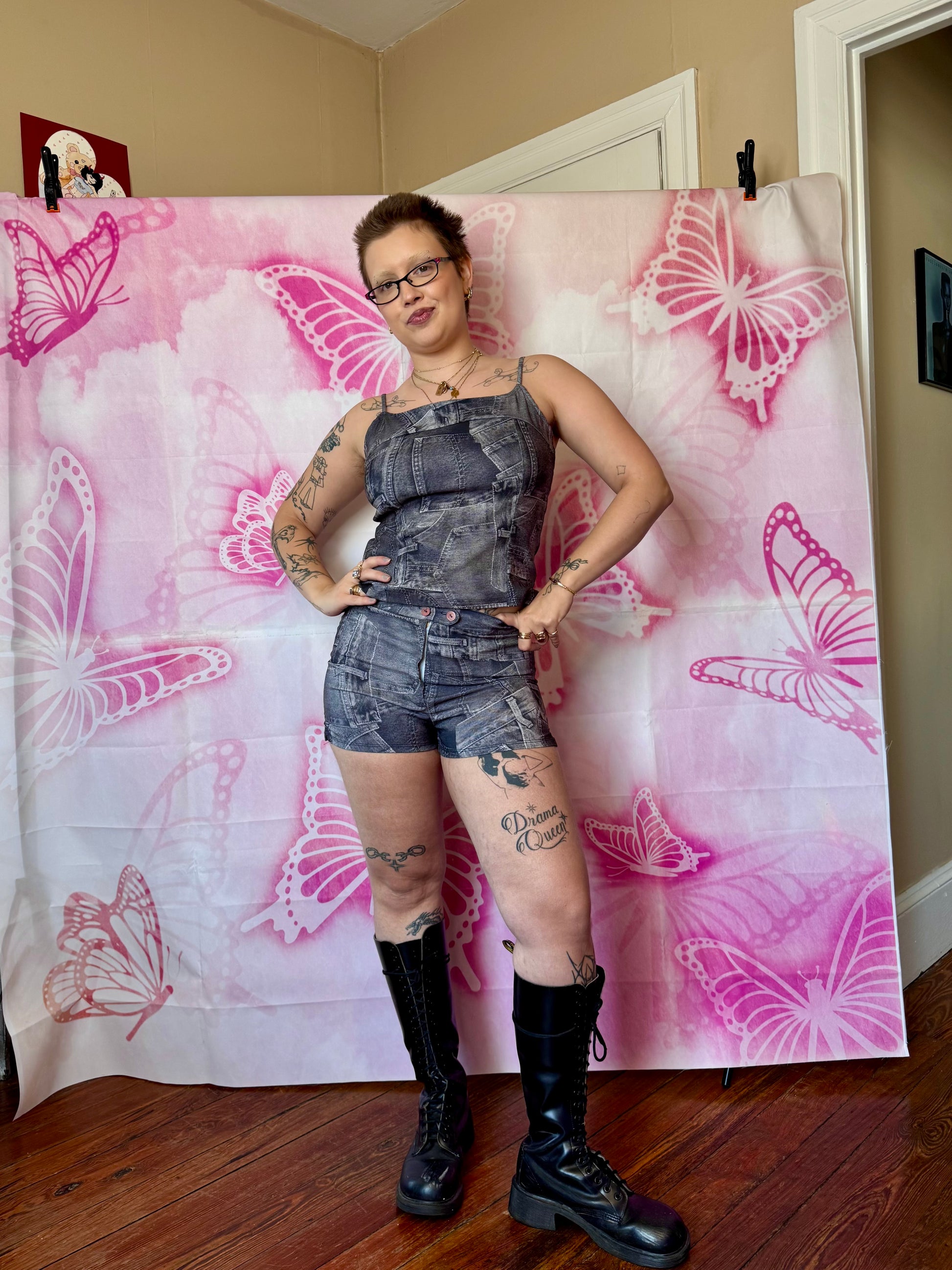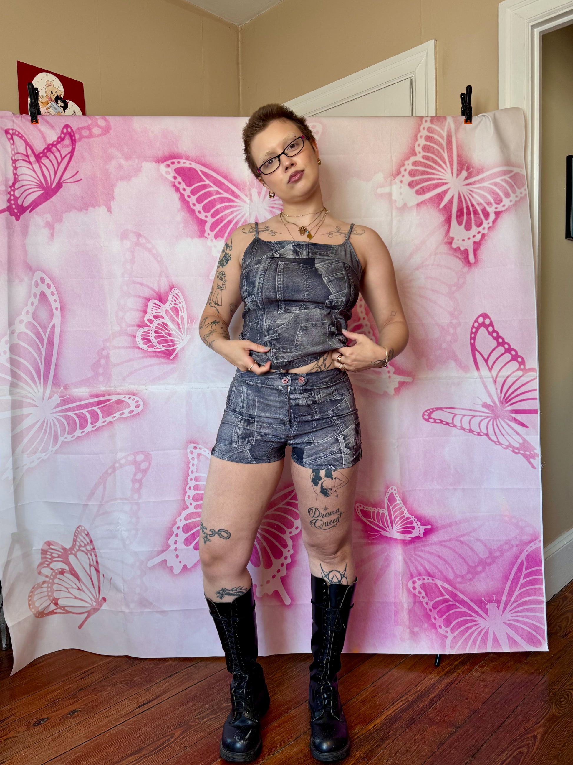 Measurements: cami: 5" straps, 36" bust, 14"long; shorts: 27"-28" stretch waist, 8" rise, 32" hips