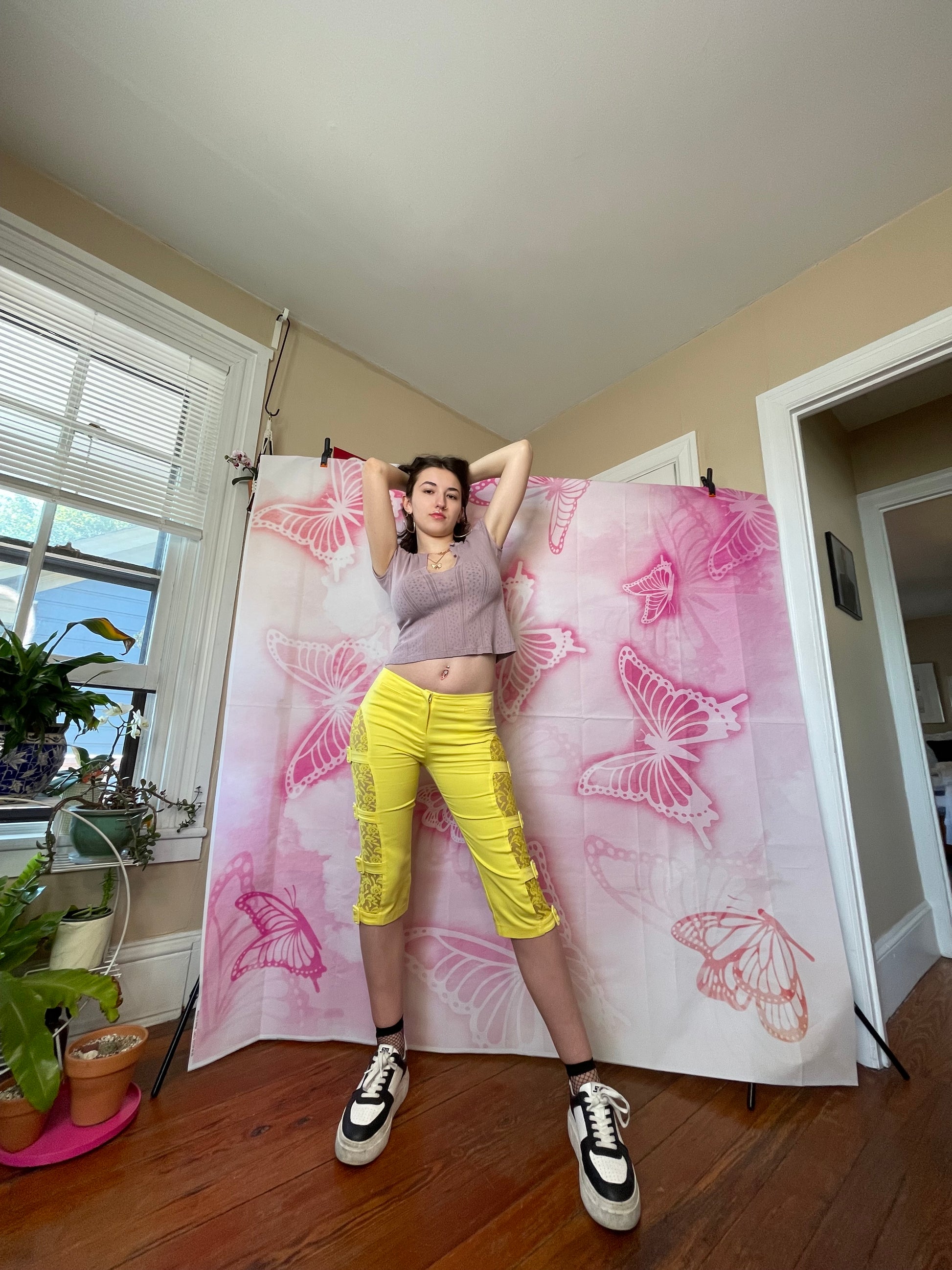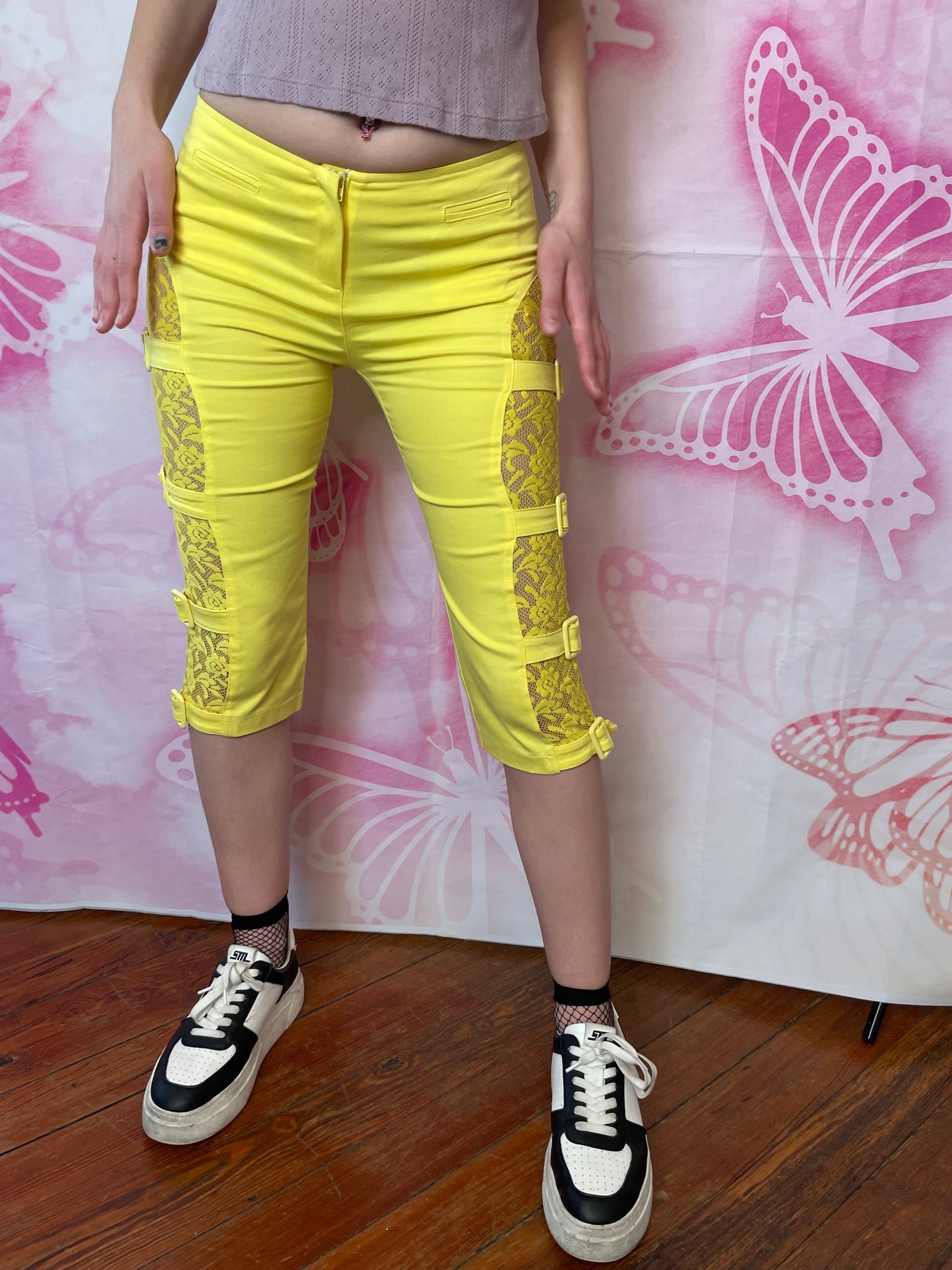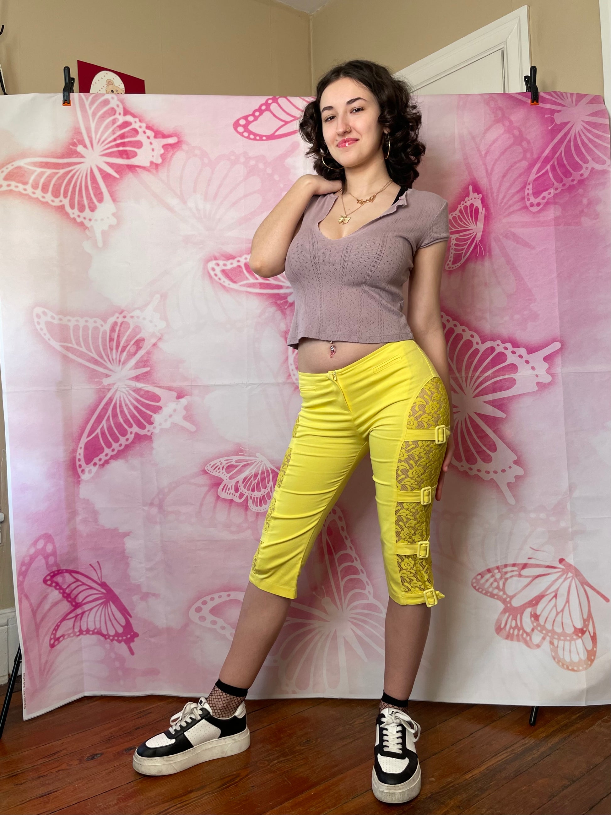 Measurements: 30" waist, 8.5" rise, 32" hips, 17.5" inseam, 7" leg opening