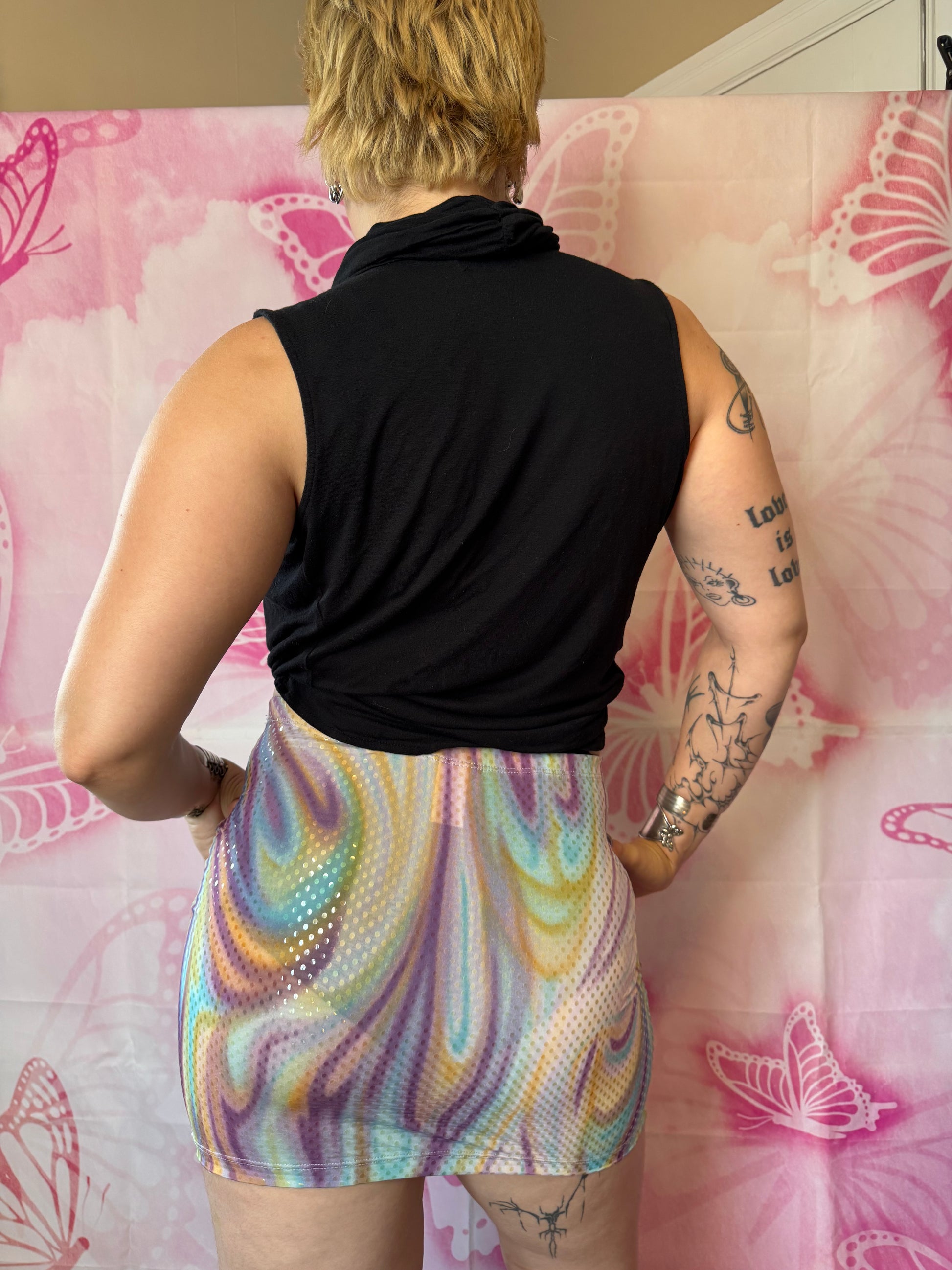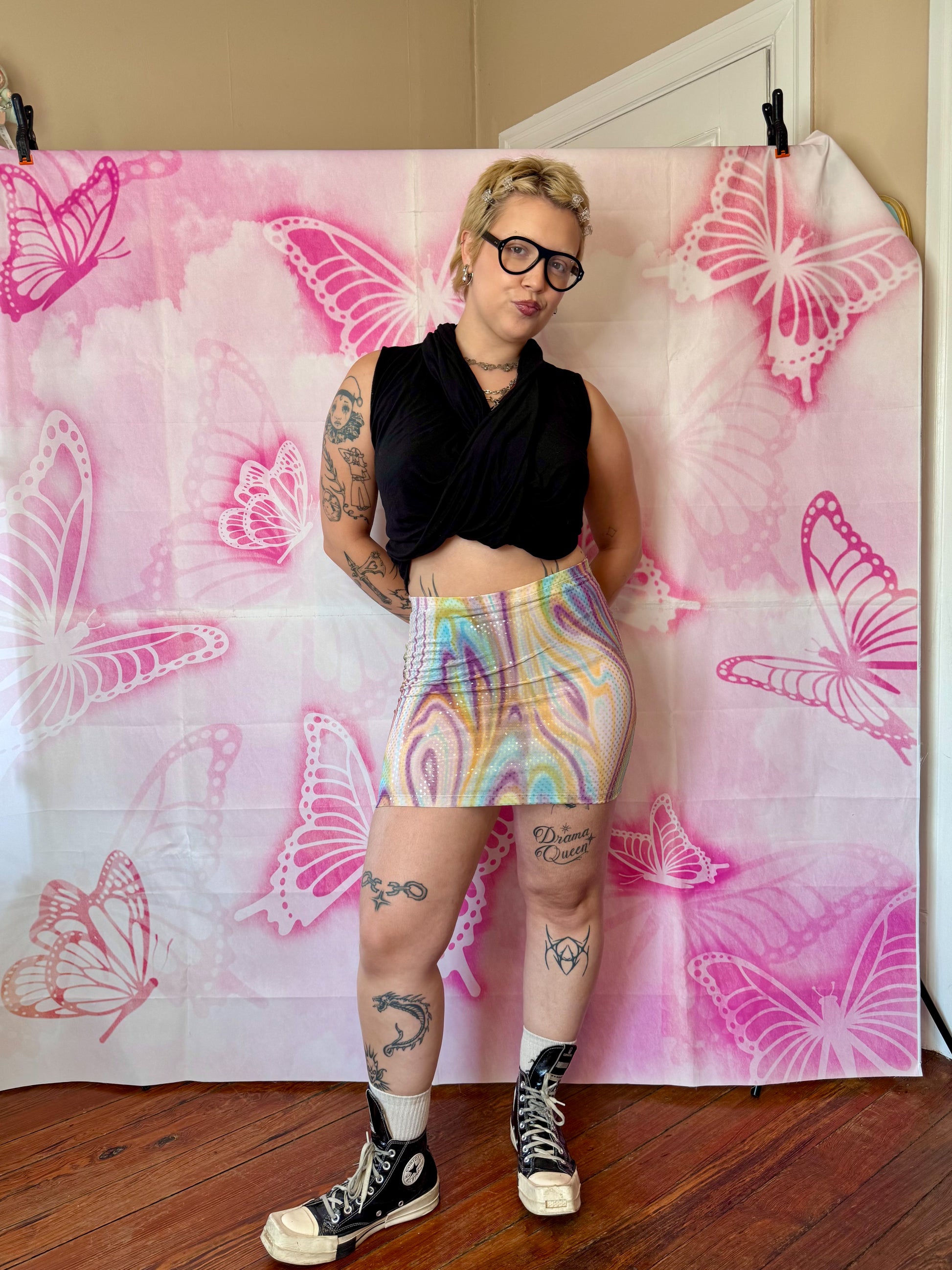 Measurements: 28-30" stretch waist, 34" hips, 13.5" long